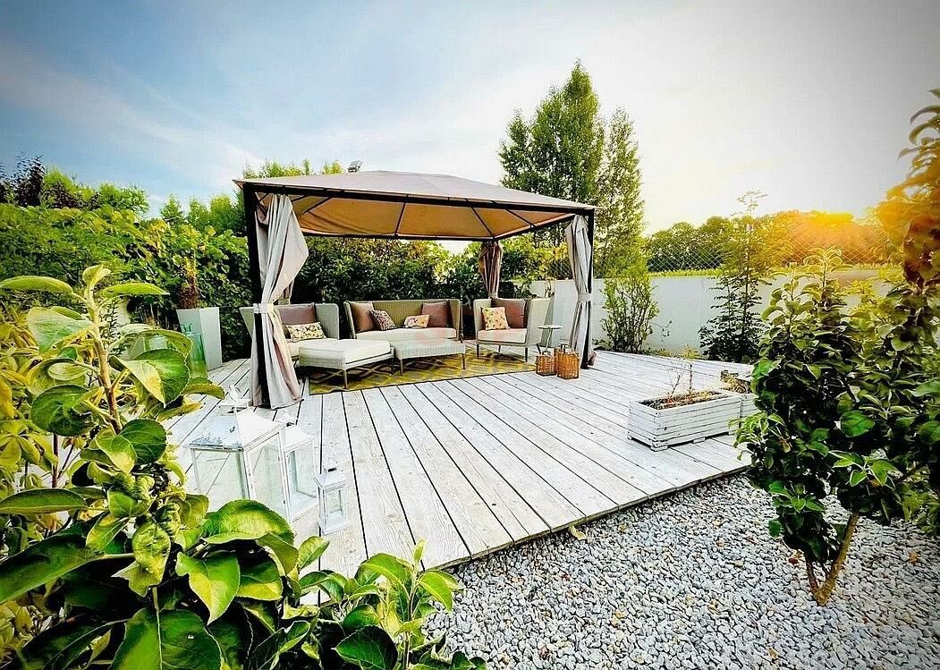- dwa boczne tarasy: kącik grillowy i pawilon.